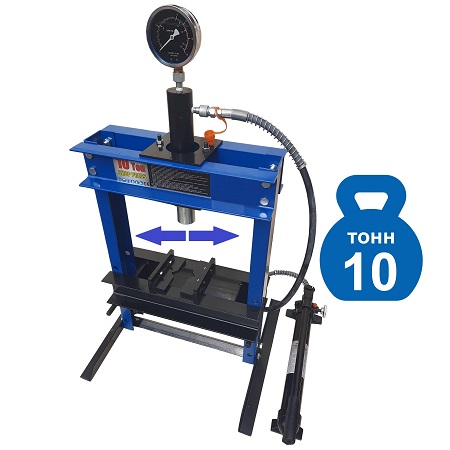 Усилие 10 тонн. Настольный. Ручной. Для запрессовки подшипников, деталей машин, втулок и т.п. в автосервисе, мастерских по ремонту лодочных моторов, велосипедов и т.п. Гидроцилиндр с пуансоном имеет возможность перемещения по всей ширине рамы. Контроль усилия – визуально по шкале манометра. Интервал пуансона 135 мм. Рабочее окно: 400 x 350 мм.