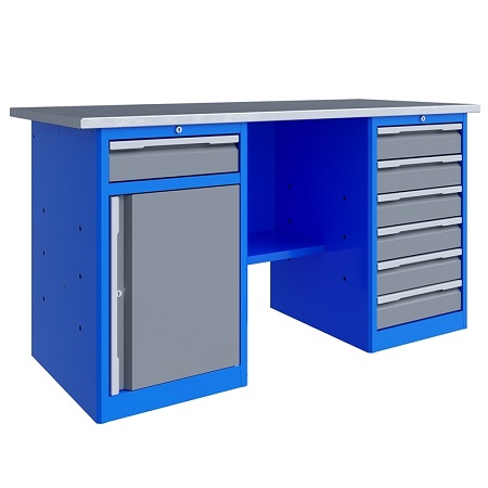 Верстак двухтумбовый поставляется в разобранном виде (4 элемента). Нагрузка на столешницу до 600 кг. Стандартный цвет: корпус - серый глянец RAL 7030, ящики и двери тумб - синий RAL 5017. Размеры:855x1400x700 мм. Масса: 107 кг.