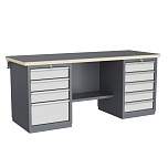 Двухтумбовый. Допустимая нагрузка на столешницу 1000 кг. Опорные элементы выполнены сварными из холоднокатаной стали. Для выполнения сборочных, ремонтных, слесарных, монтажных и других видов работ на производстве, в сервисных центрах, мастерских, гаражах, а также для обучения технологии в учебных заведениях. Комплектуется полкой-стенкой, расположенной под столешницей для удобного размещения габаритного инструмента и оснастки. Размеры верстака: 855x1796x696 мм. Вес: 133 кг. Поставляется в 4 комплектациях на выбор.