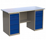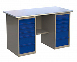 Верстак двухтумбовый поставляется в разобранном виде (4 элемента). Нагрузка на столешницу до 600 кг. Стандартный цвет: корпус - серый глянец RAL 7030, ящики и двери тумб - синий RAL 5017. Размеры:855x1400x700 мм. Масса: 116 кг.