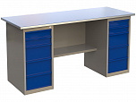 Двухтумбовый. Допустимая нагрузка на столешницу 1000 кг. Опорные элементы выполнены сварными из холоднокатаной стали. Для выполнения сборочных, ремонтных, слесарных, монтажных и других видов работ на производстве, в сервисных центрах, мастерских, гаражах, а также для обучения технологии в учебных заведениях. Комплектуется полкой-стенкой, расположенной под столешницей для удобного размещения габаритного инструмента и оснастки. Размеры верстака: 855x1596x696 мм. Вес: 82 кг. Поставляется в 4 комплектациях на выбор.