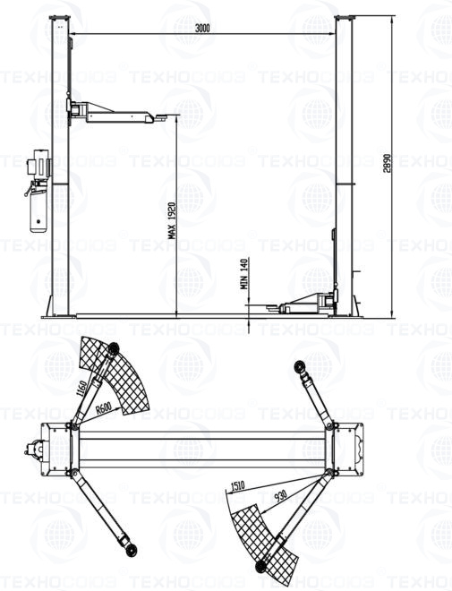 Расстояние между колонами подъемника, мм. 3000