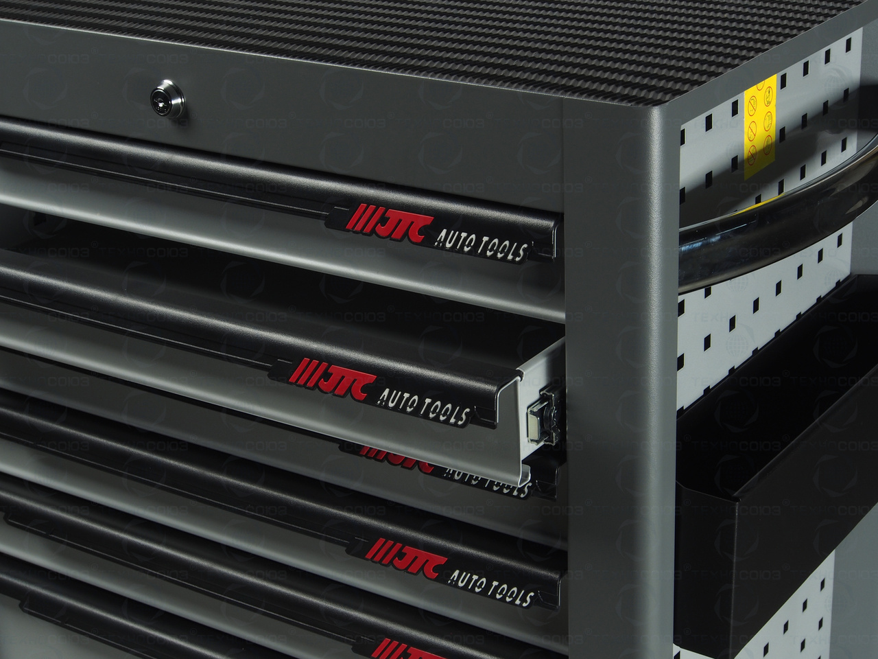 • Перфорированные внутренние стенки боковых ящиков с квадратными отверстиями предоставляют возможность разместить дополнительные аксессуары для хранения инструментов. Применяется с серией подвесных приспособлений JTC-3218.