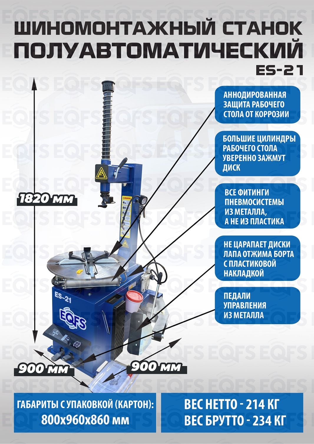 ES-21 Шиномонтажный станок. Полуавтомат. Для дисков: внешний 11÷18”, внутренний 12÷20”. Большой круглый стол Ø 560мм. В комплекте: пистолет для подкачки шин + монтажка + пластиковые накладки на зажимные кулачки + регулятор давления с влагоотделителем и манометром.