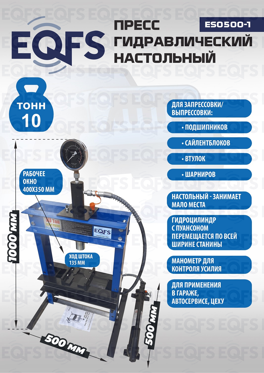 Настольный. Малый гидравлический, ручной, сборно-разборный. Гидроцилиндр с пуансоном имеет возможность перемещения по всей ширине станины. Контроль усилия – визуально по шкале манометра. Предназначен для запрессовки деталей машин в автосервисе, мастерских по ремонту лодочных моторов, велосипедов и т.п. Цвет синий. Усилие 10 тонн. Для запрессовки подшипников, деталей машин, втулок и т.п. Интервал пуансона 135 мм. Рабочее окно: 400 x 350 мм. Идеален для гаража.