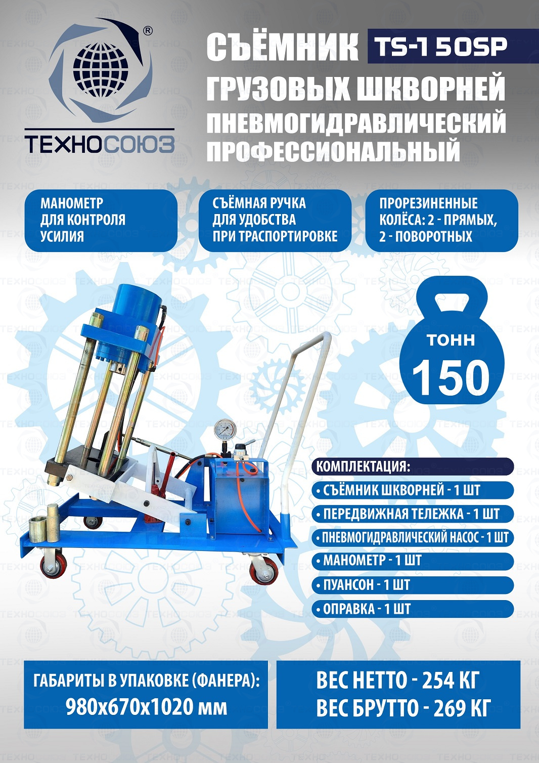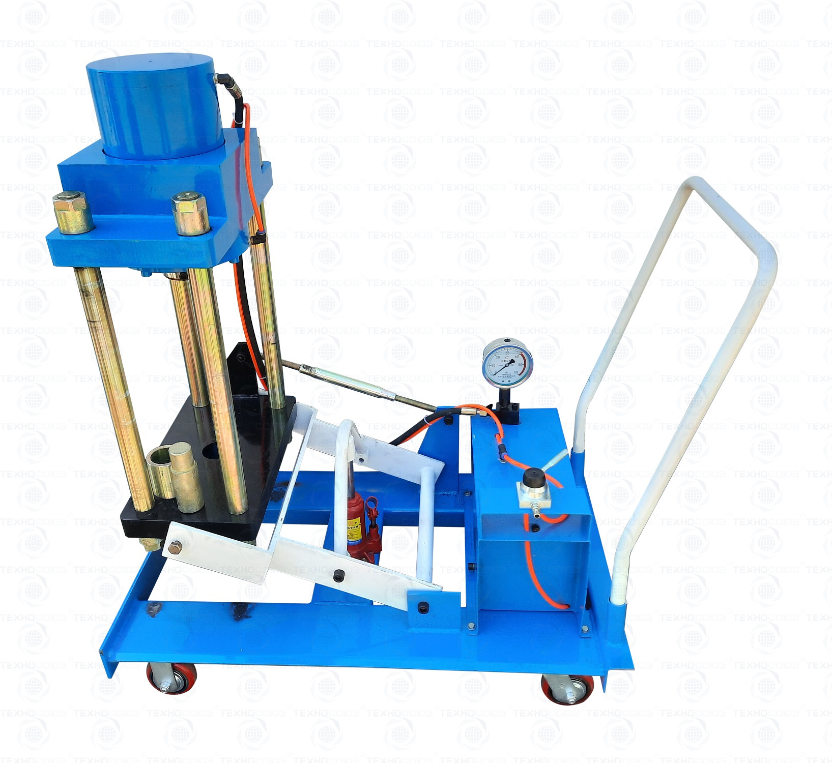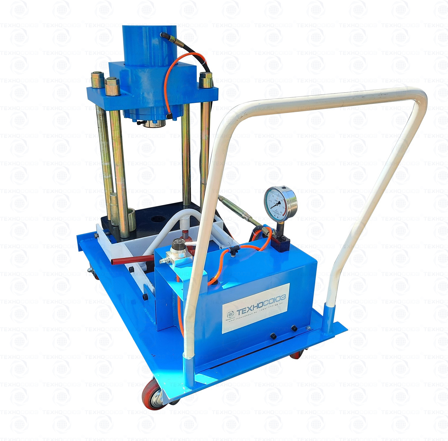 Мобильный. Позволяет работать под разными углами 1 человеку. Сокращает время ремонта. Для выпрессовки шкворней из поворотной цапфы. Для коммерческих и грузовых авто отечественного и импортного производства: MAN, MERSEDES, SCANIA, VOLVO, Корейские и Китайские автомобили, а также трактора, погрузчики, спецтехника. Пневмогидравлический привод - требуется подключение сжатого воздуха. Рабочее окно 400x320 мм. Усилие 150 тонн. Применяется для выпрессовки подшипников, валов, втулок, сайлентблоков.
