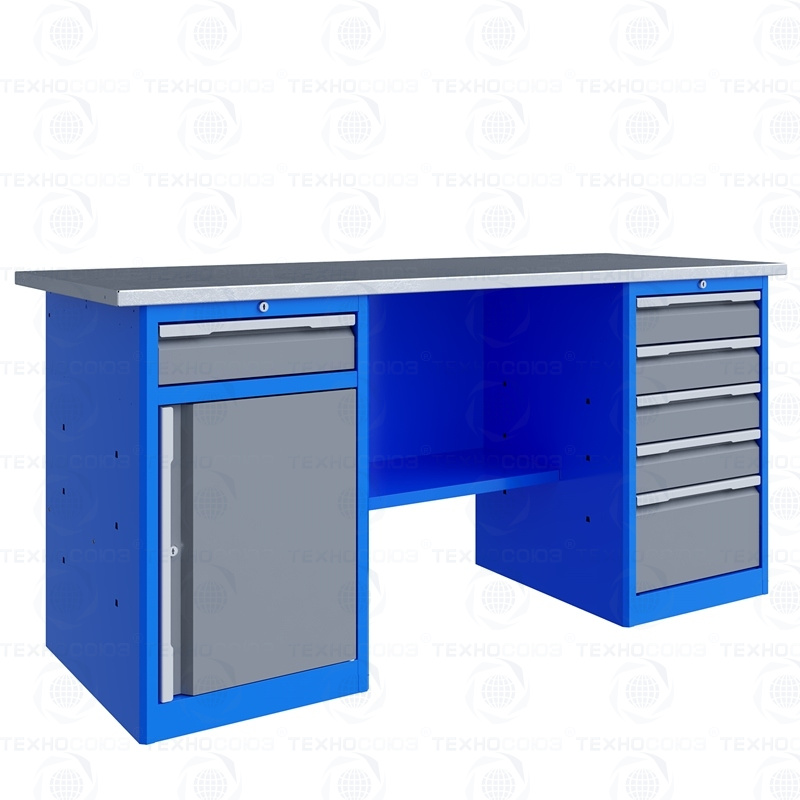 Тумбы верстаков выполнены сварными. Ящики в тумбах устанавливаются на шариковых телескопических направляющих полного выдвижения. В тумбе P5 установлено четыре малых и один большой ящик. Внутренние размеры малых ящиков (ВхШхГ), не более: 103 х 397 х 520 мм. Внутренние размеры больших ящиков (ВхШхГ), не более: 222 х 397 х 520 мм. Тумбы с ящиками снабжены общим центральным замком с поворотом ригеля 180 градусов и подпружиненной тягой. В тумбе P8 установлен малый ящик и имеется отделение с дверью и одной полкой. Ящик снабжен центральным замком с поворотом ригеля 180 градусов и подпружиненной тягой. Полка устанавливается на парах специальных формованных зацепов, выполненных в боковых стенках тумбы. Имеется возможность смены стороны открывания двери. Дверь тумбы снабжена центральным замком с поворотом ригеля 180 градусов. В комплекте имеется два ключа с каждым замком.